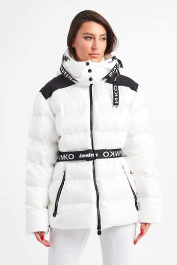 Piumino corto imbottito Invicta X PINKO in tela tecnica dalla particolare mano soft. Collo a cappuccio caratterizzato da cinturino con logo "PINKO Invicta" e chiuso da bottoni davanti. Spalle e sprone sul retro a contrasto, maniche lunghe e tasche chiuse da zip sui fianchi. Completo di cintura in nastro tecnico personalizzata con logo "PINKO invicta". Chiusura con zip davanti, doppio cursore. La modella è alta 179cm e indossa una taglia 40.